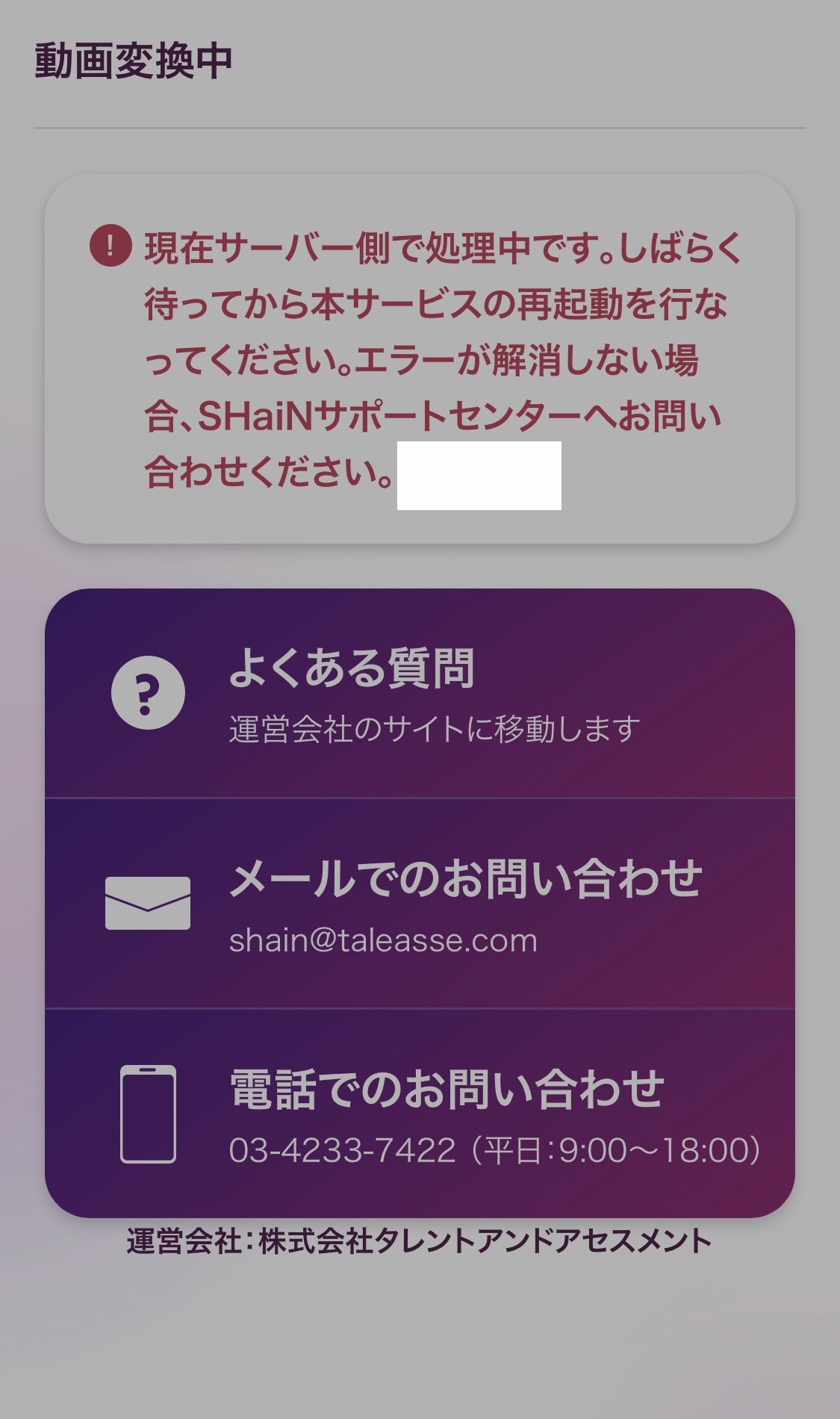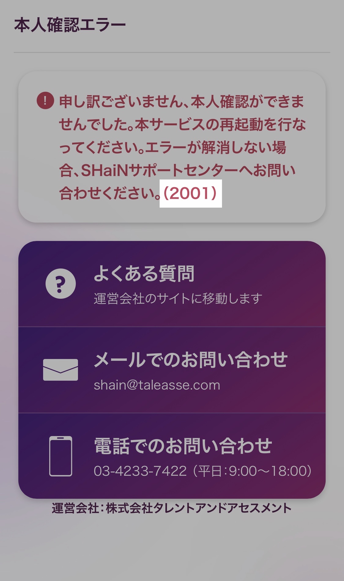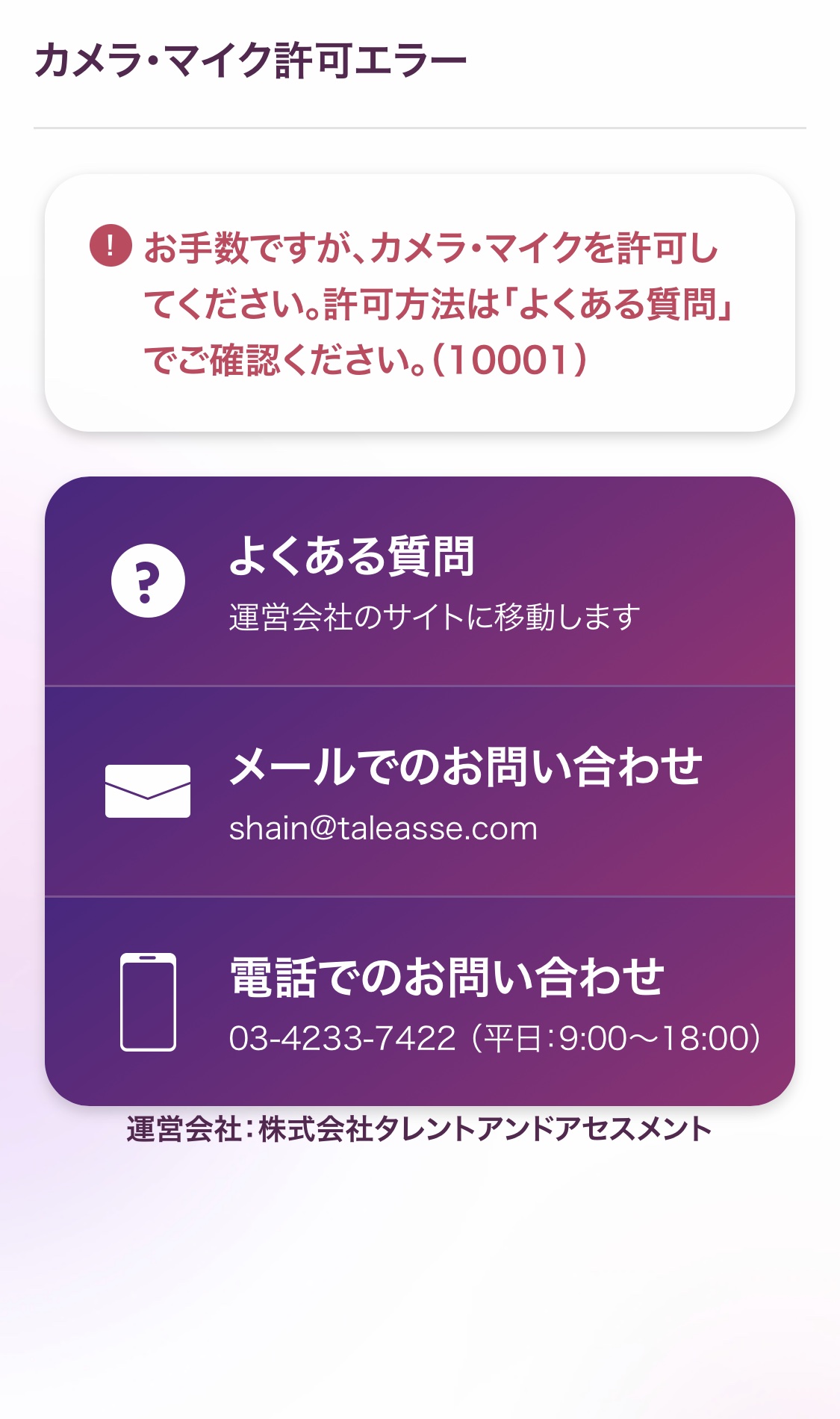 表示される対処方法にしたがって操作してください。それでも解消しない場合、エラー内容をSHaiN受検者サポートセンター(shain@taleasse.com)までご連絡ください。